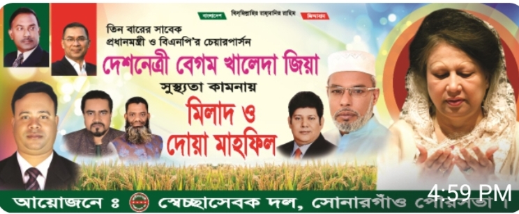 নারায়ণগঞ্জের সোনারগাঁ পৌরসভা স্বেচ্ছাসেবক দলের উদ্যোগে বিএনপির চেয়ারপারসন ও দেশের তিনবারের সাবেক প্রধানমন্ত্রী বেগম খালেদা জিয়ার রোগমুক্তি কামনায় দোয়া ও মিলাদ মাহফিল অনুষ্ঠিত হয়েছে।