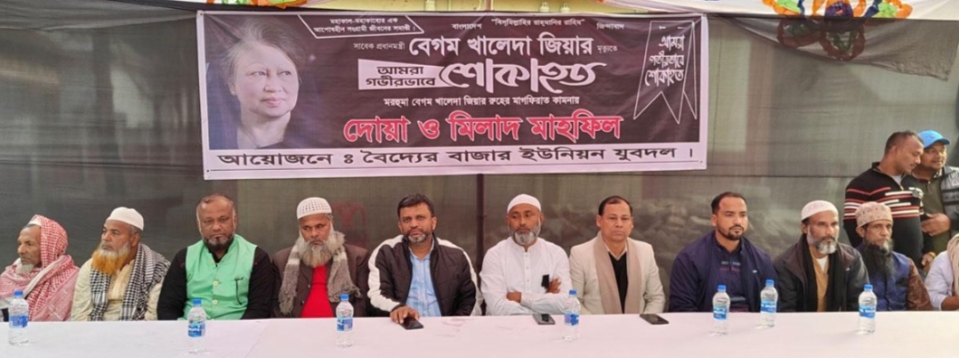 বৈদ্দ্যের বাজার ইউনিয়ন যুবদলের উদ্যোগে সাবেক প্রধানমন্ত্রী ও বিএনপি চেয়ারপারসন মরহুমা বেগম খালেদা জিয়ার রুহের মাগফেরাত কামনায় দোয়া মাহফিল অনুষ্ঠিত হয়েছে। অনুষ্ঠানে দলীয় নেতাকর্মীরা মরহুমা নেত্রীর আত্মার শান্তি কামনার পাশাপাশি দেশ ও জাতির কল্যাণ এবং গণতন্ত্র পুনরুদ্ধারের জন্য বিশেষ দোয়া ও মোনাজাতে অংশ নেন।