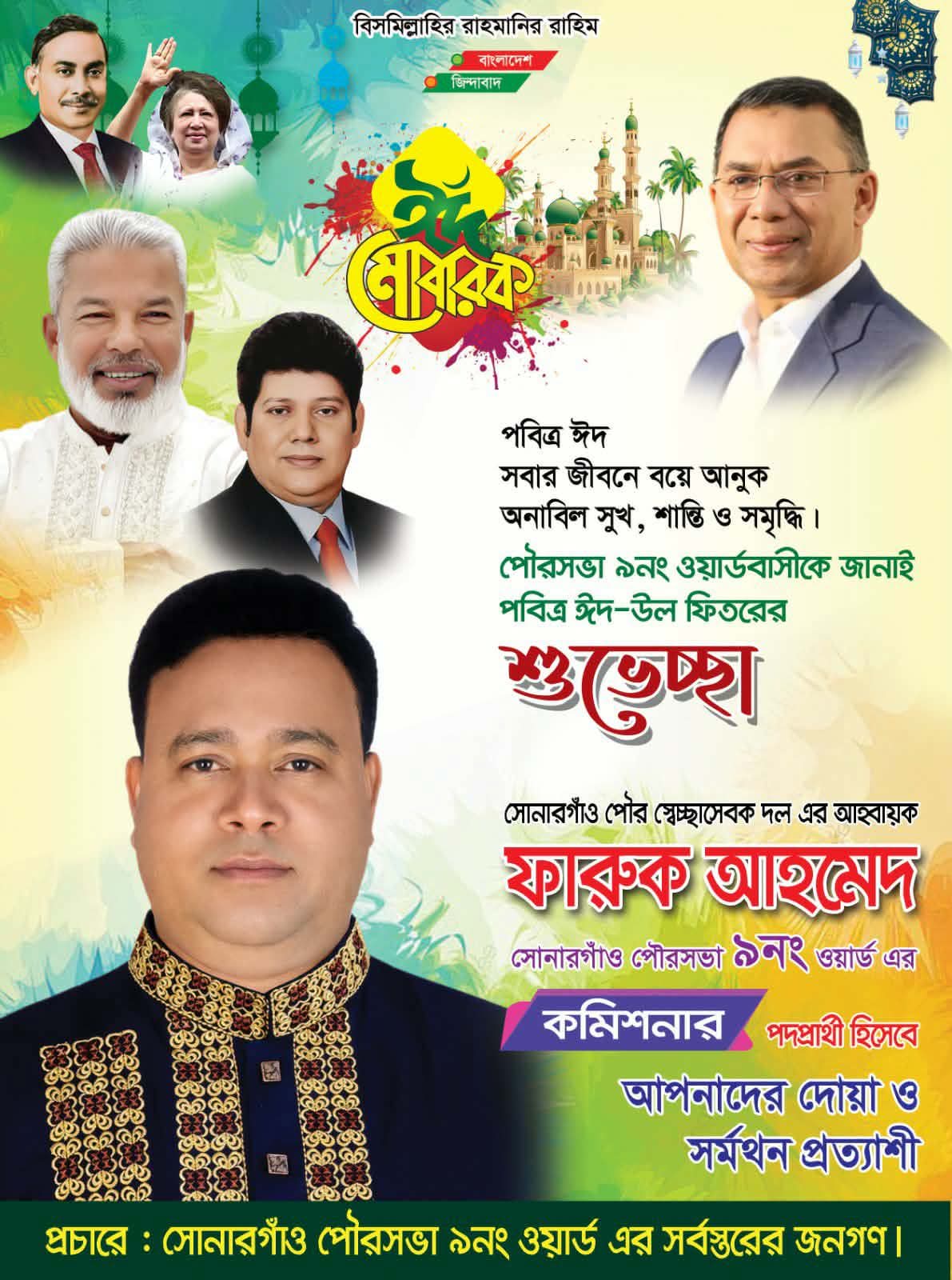 পবিত্র ঈদুল ফিতর উপলক্ষে সোনারগাঁও পৌরসভার ৯নং ওয়ার্ডবাসীসহ দেশ-বিদেশে অবস্থানরত সকল মুসলমানদের আন্তরিক শুভেচ্ছা ও অভিনন্দন জানিয়েছেন সোনারগাঁও পৌর স্বেচ্ছাসেবক দলের আহ্বায়ক ফারুক আহমেদ।