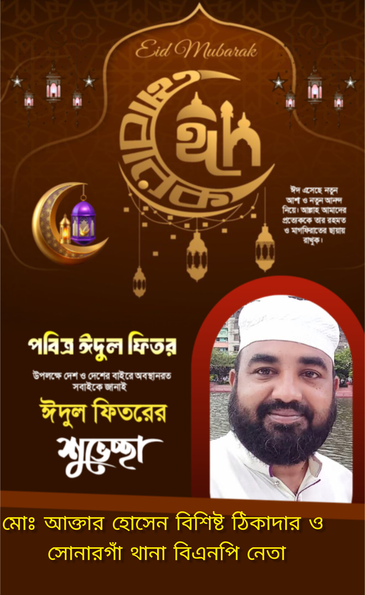 পবিত্র ঈদুল ফিতর উপলক্ষে নারায়ণগঞ্জের সোনারগাঁ উপজেলার বৈদ্যের বাজার ইউনিয়নবাসীসহ দেশ ও বিদেশে অবস্থানরত সকল মুসলমানকে আন্তরিক শুভেচ্ছা ও ঈদ মোবারক জানিয়েছেন বিএনপি নেতা ও বিশিষ্ট ঠিকাদার মোঃ আক্তার হোসেন।